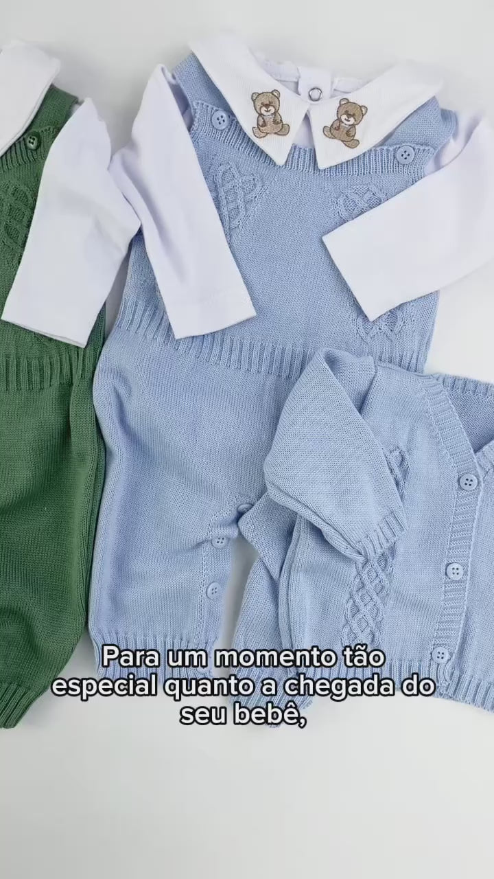 Jardineira em tricot, com detalhes delicados e fechamento em botões, garantindo praticidade e charme.